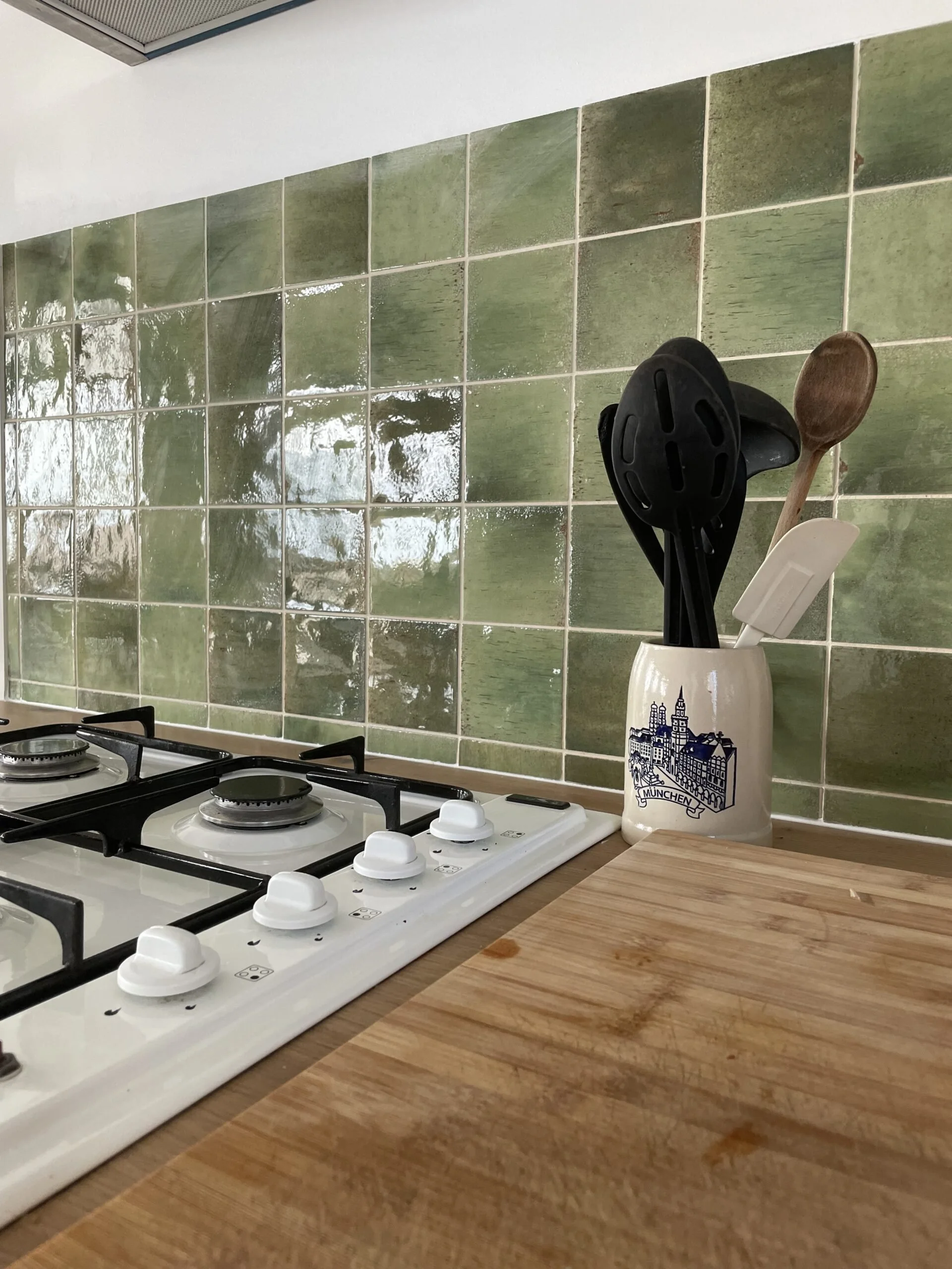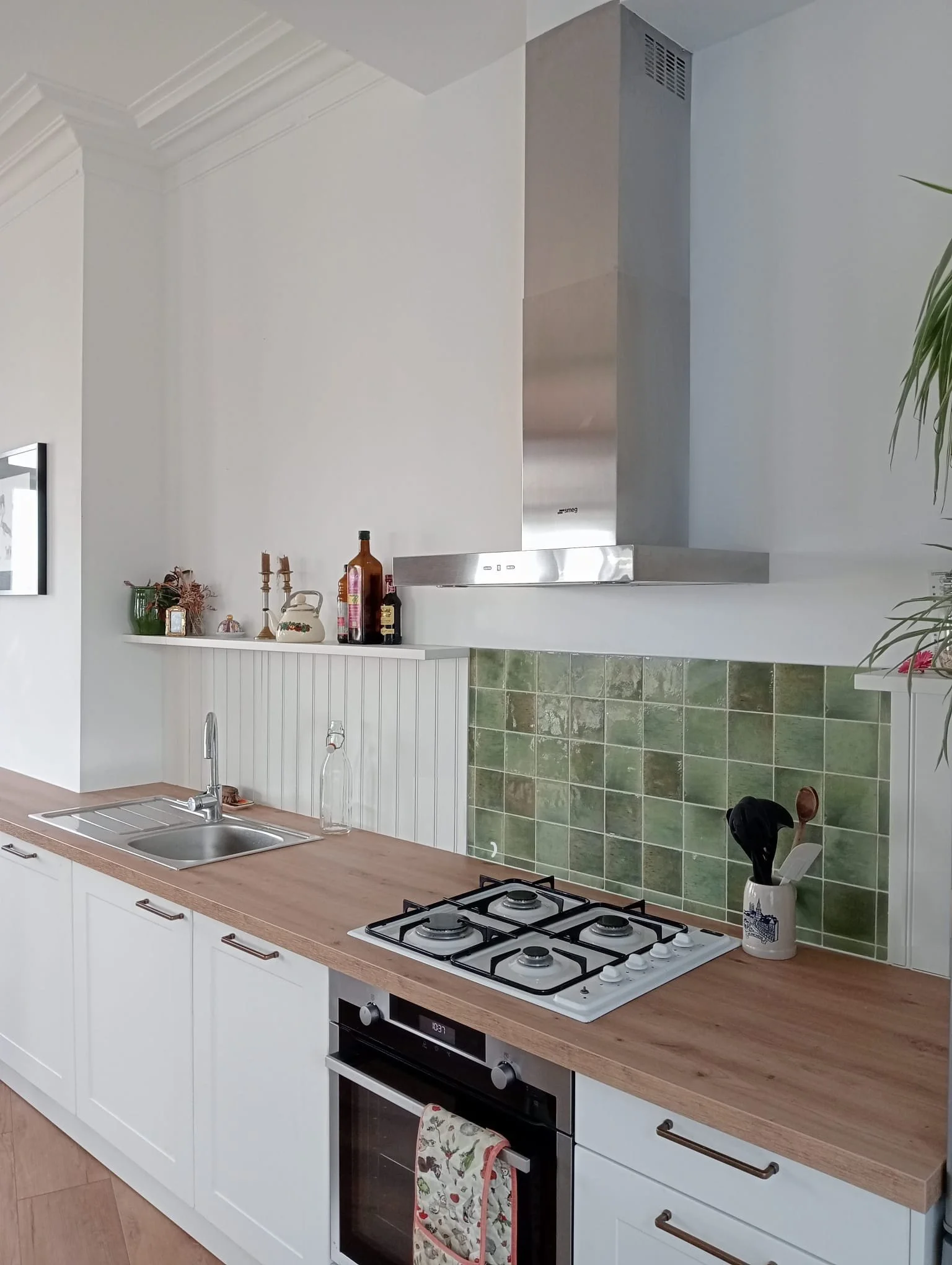 Opter pour un triptyque de couleur permet de luter contre la monotonie. l’ajout d’une touche différente des tons de façades et plan de travail permet de dynamiser le visuel de la cuisine. Le vert est un choix simple et sans risque avec le blanc et le bois.
