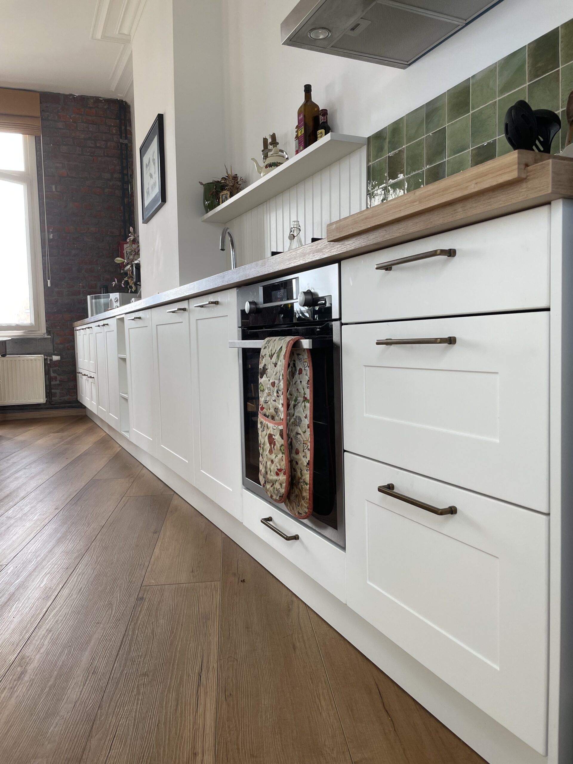 Les poignées sont un élément à ne pas négliger suivant le style que vous souhaitez adopter. Ici, elles permettent de renforcer l’effet cottage de la cuisine. Bien travailler leurs positionnement met également en valeur les lignes continuent et épurées d’une cuisine allongée.