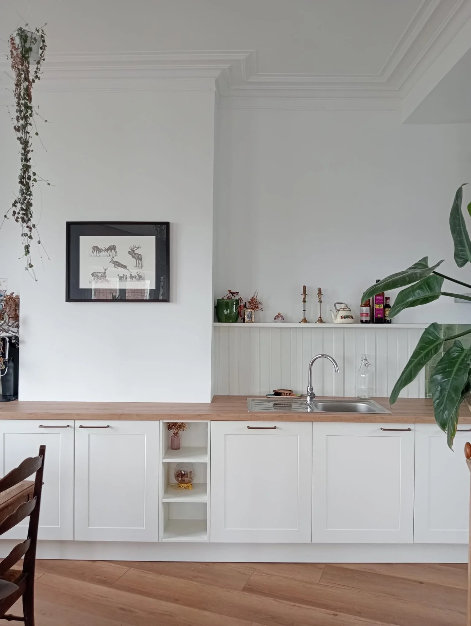 Ne tombez pas dans le piège d’une cuisine surchargée. Réfléchissez aux rangements dont vous avez besoin afin de ne pas trop remplir votre cuisine. Les étagères épaisses permettent d’agrandir visuellement votre espace, tout en créant une surface déco pour personnaliser votre intérieur.